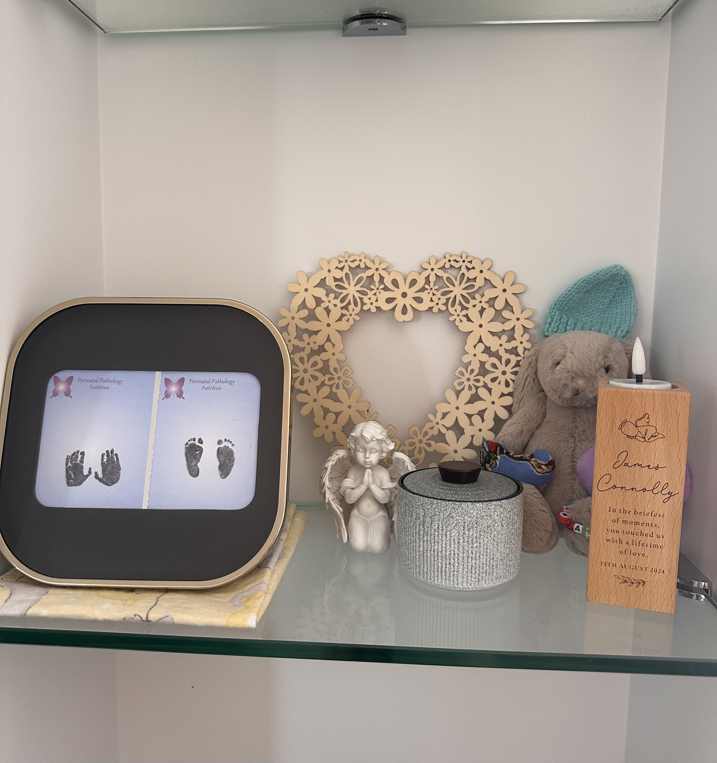 My husband, Liam Connolly, is 39. Our baby girl Mila was born on October 2, 2025, and is almost five months old. Liam also has a daughter, my stepdaughter Sophia, who turns seven this year. Among all the love and chaos of our family, we keep James close. We have a small shrine for him, his ashes, his tiny foot and handprints, his baby wrap and beanie. At Christmas, his bauble hangs on our tree. And every day, I carry a keyring with his photo.